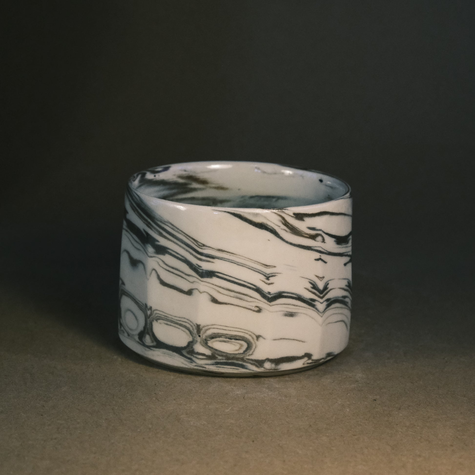 To create its dynamic surface, this stoneware cup is crafted by wedging two tones of brown clay with white stoneware. After throwing and trimming, I slice the surface with a peeler to create facets that reveal deeper, more complex layers of the marble pattern. This technique ensures every piece is a unique work of art before being high-fired to 1250°C in an electric kiln.