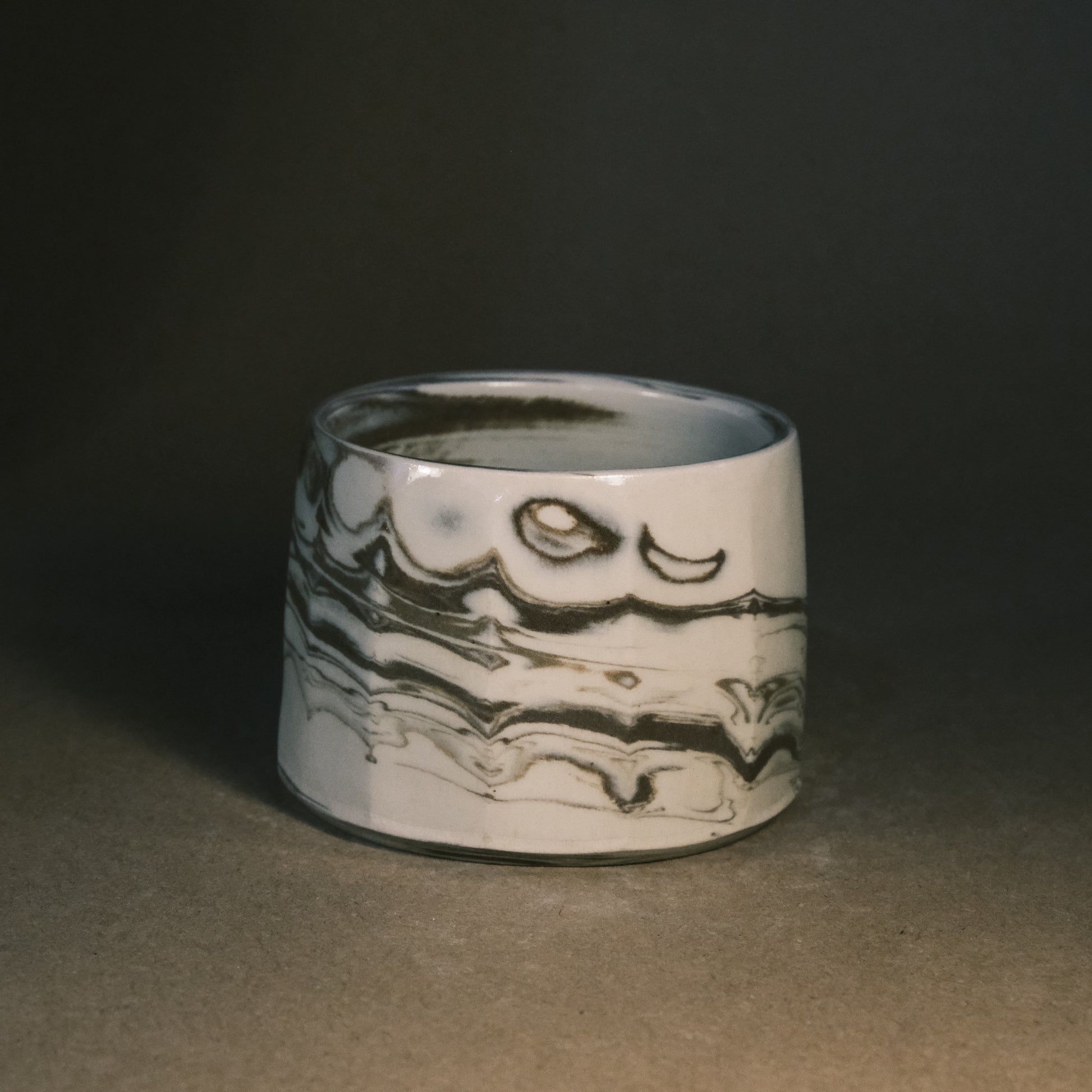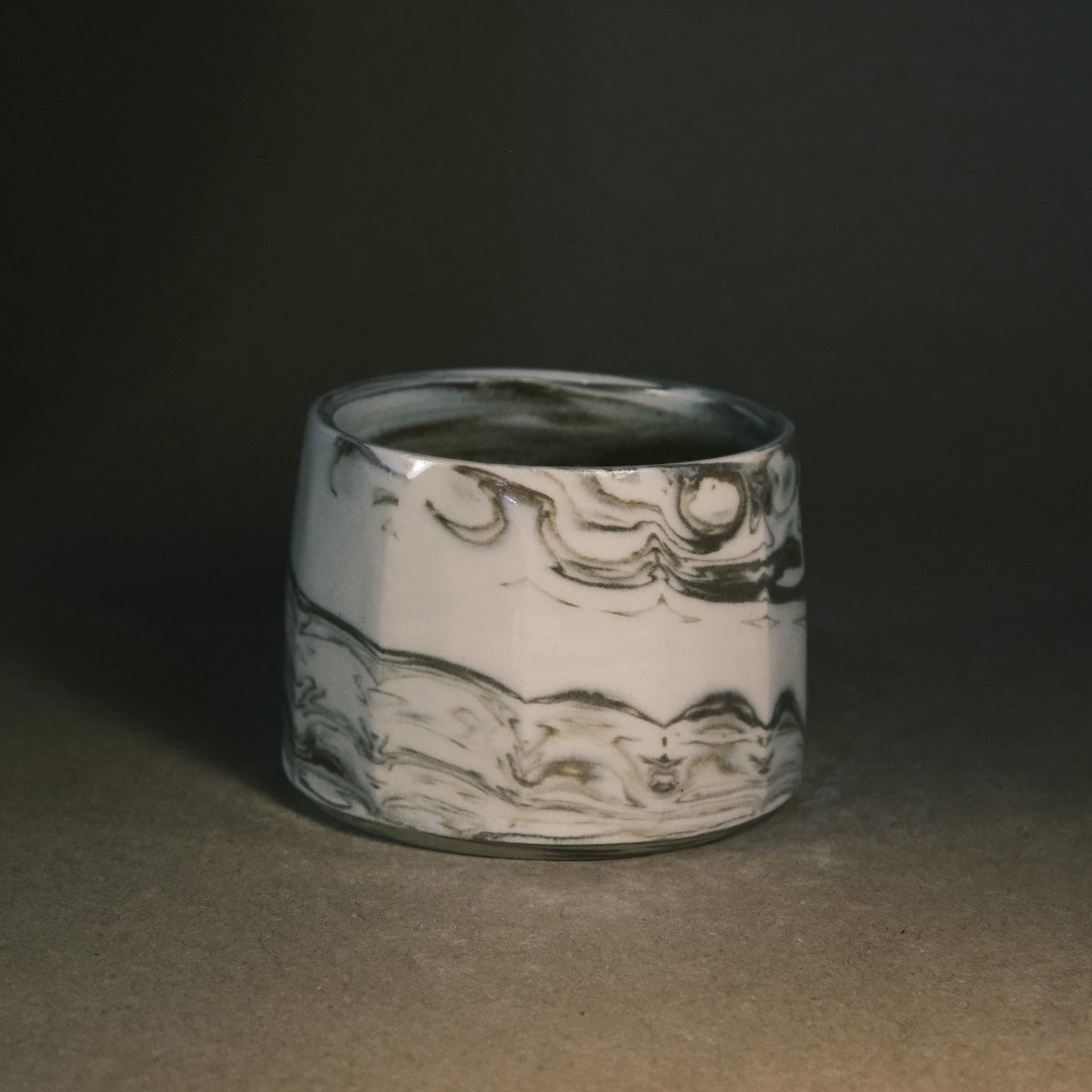 To create its dynamic surface, this stoneware cup is crafted by wedging two tones of brown clay with white stoneware. After throwing and trimming, I slice the surface with a peeler to create facets that reveal deeper, more complex layers of the marble pattern. This technique ensures every piece is a unique work of art before being high-fired to 1250°C in an electric kiln.