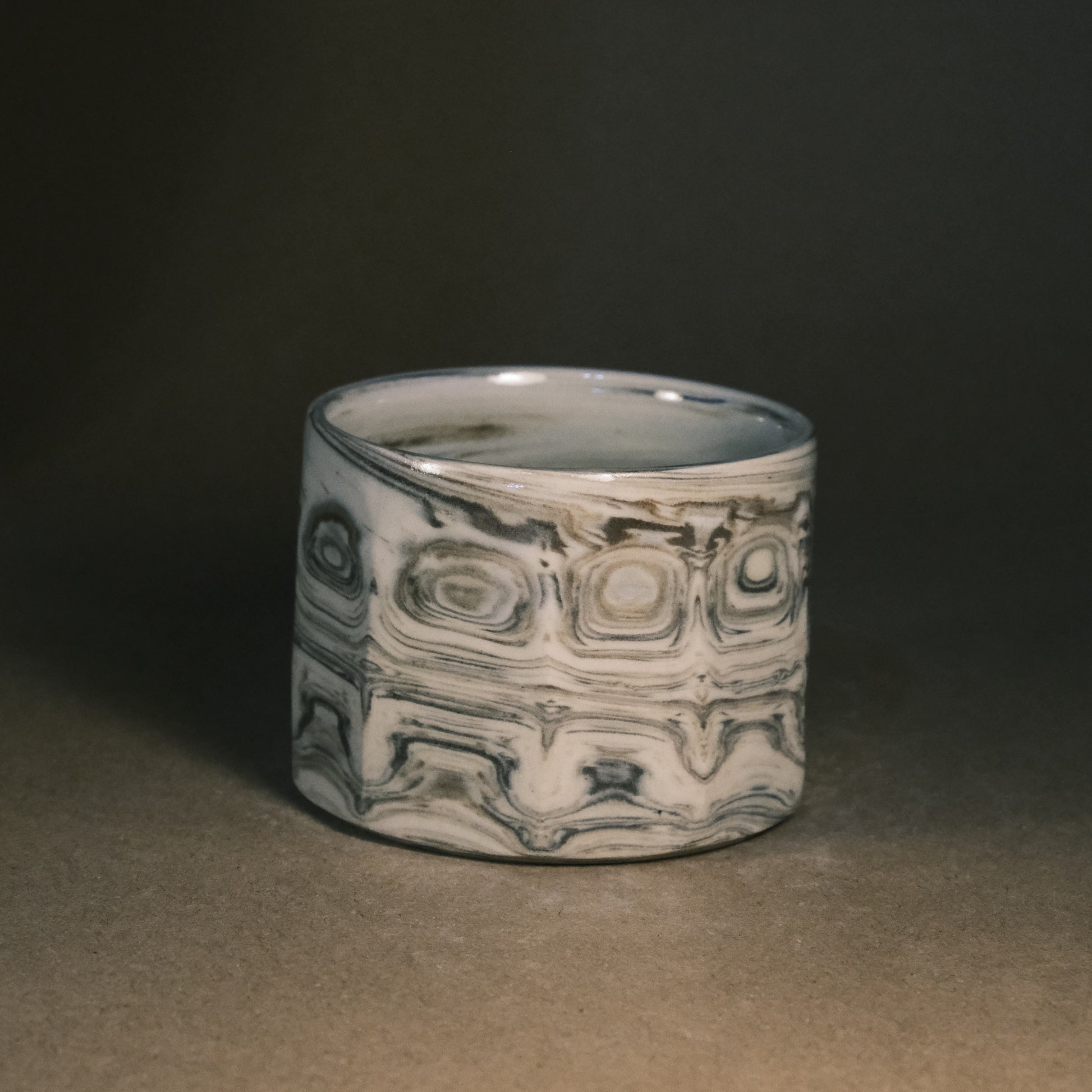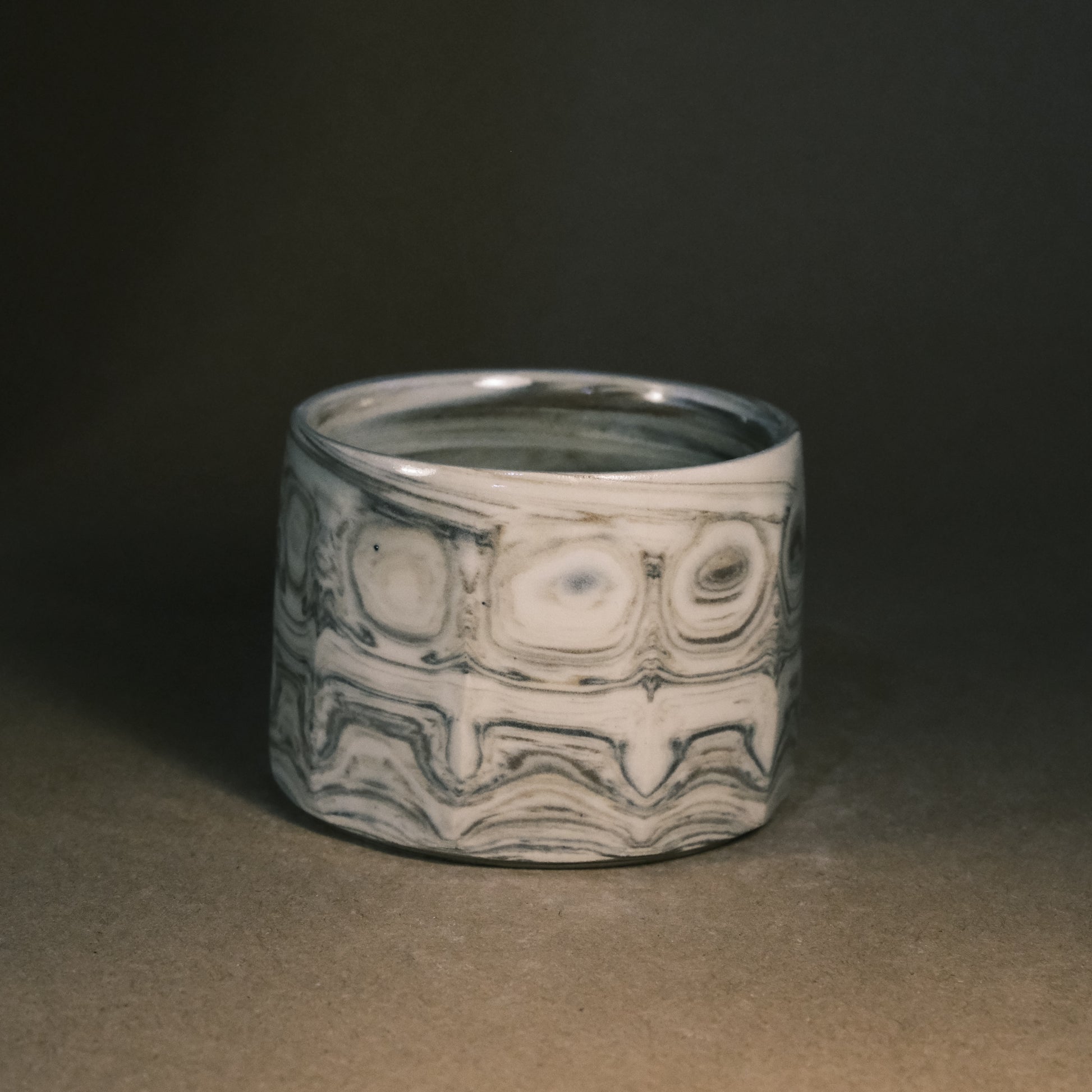 To create its dynamic surface, this stoneware cup is crafted by wedging two tones of brown clay with white stoneware. After throwing and trimming, I slice the surface with a peeler to create facets that reveal deeper, more complex layers of the marble pattern. This technique ensures every piece is a unique work of art before being high-fired to 1250°C in an electric kiln.