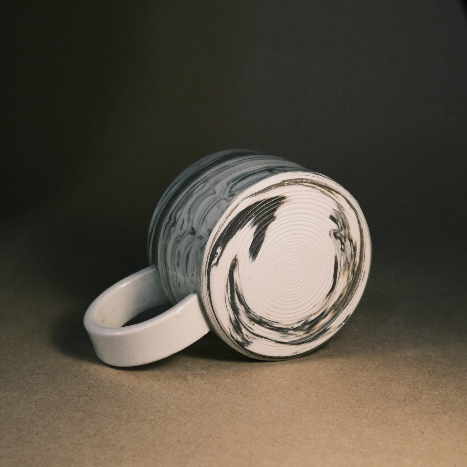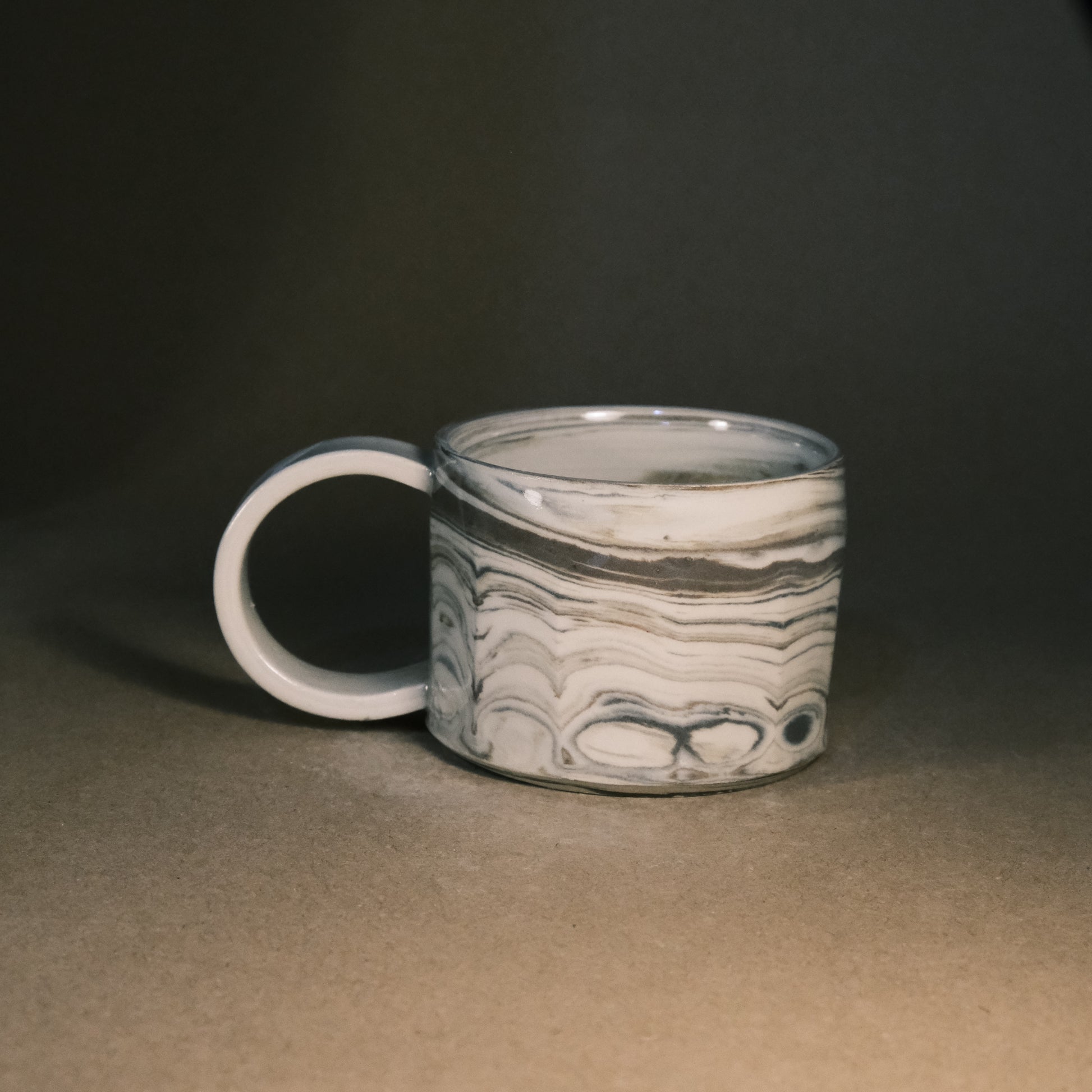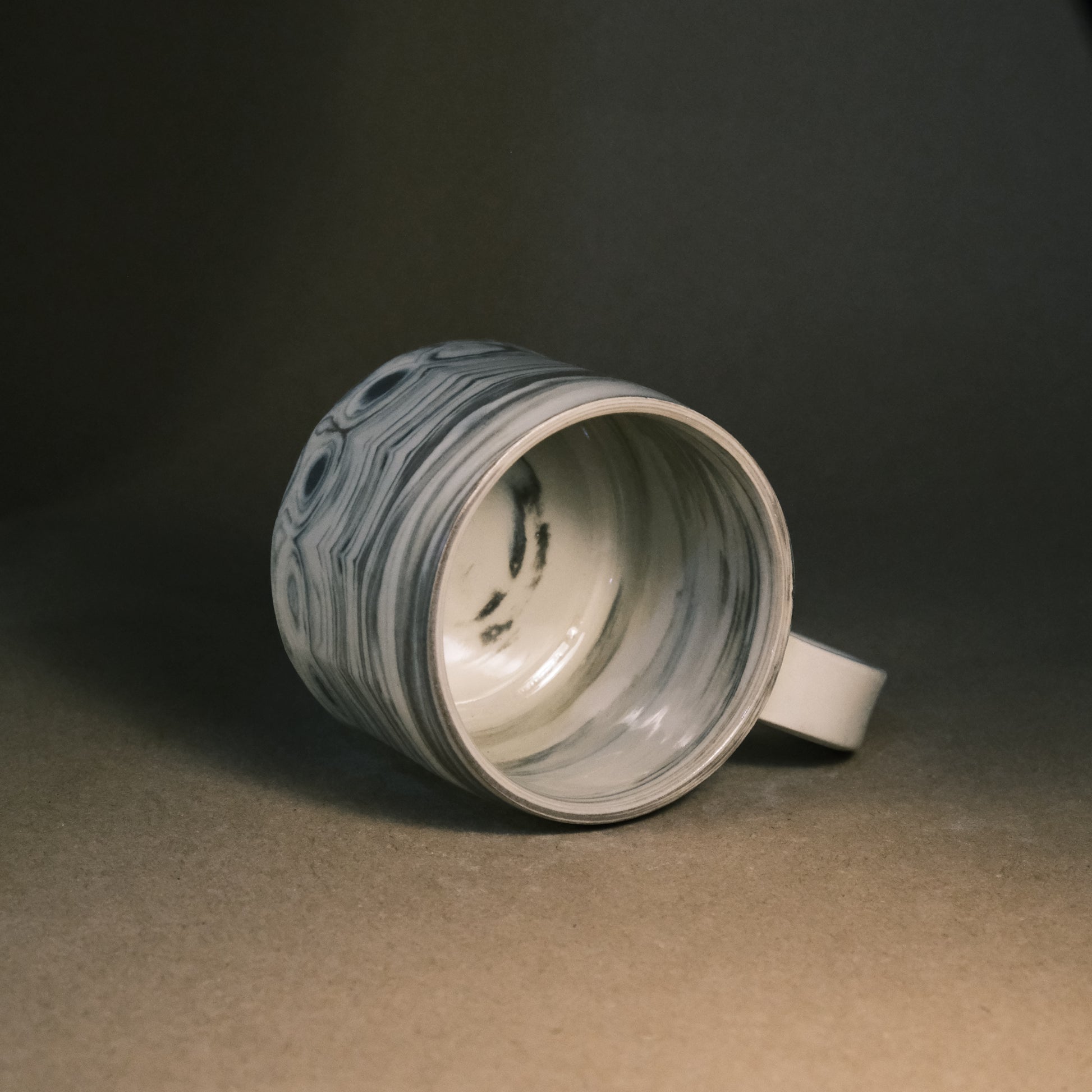 To create its dynamic surface, this stoneware cup is crafted by wedging two tones of brown clay with white stoneware. After throwing and trimming, I slice the surface with a peeler to create facets that reveal deeper, more complex layers of the marble pattern. This technique ensures every piece is a unique work of art before being high-fired to 1250°C in an electric kiln.
