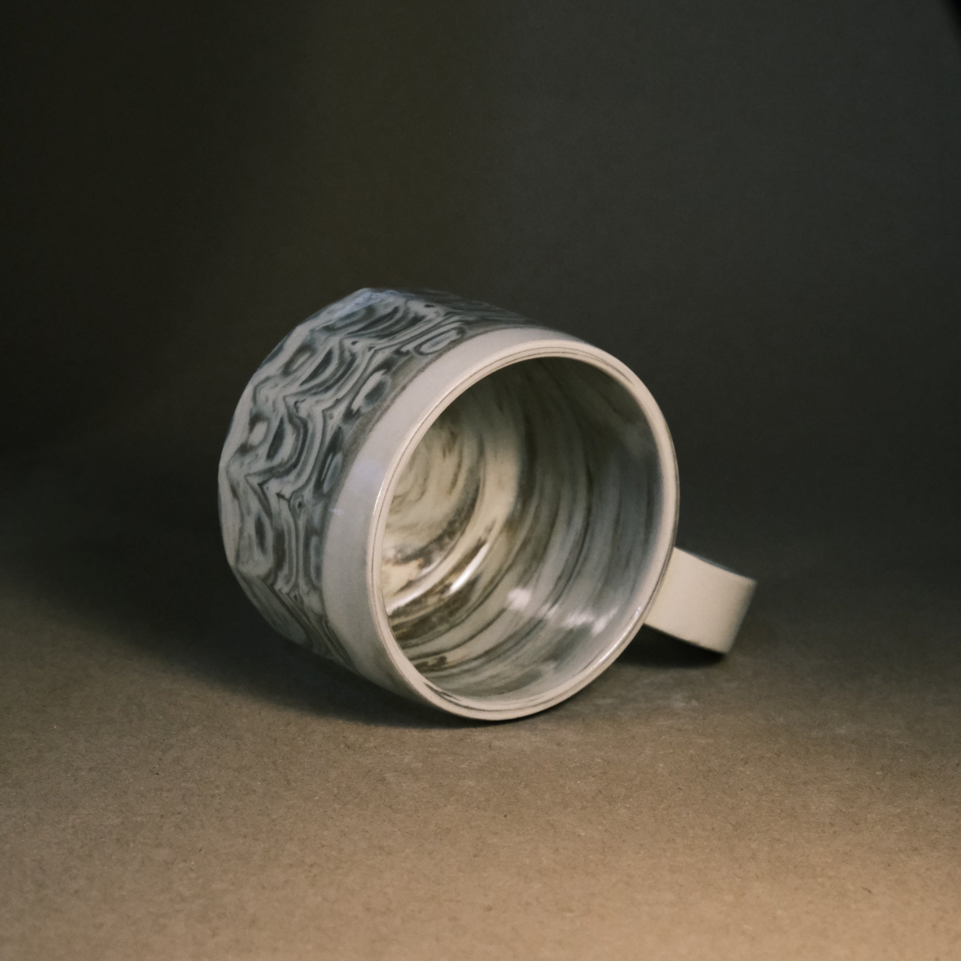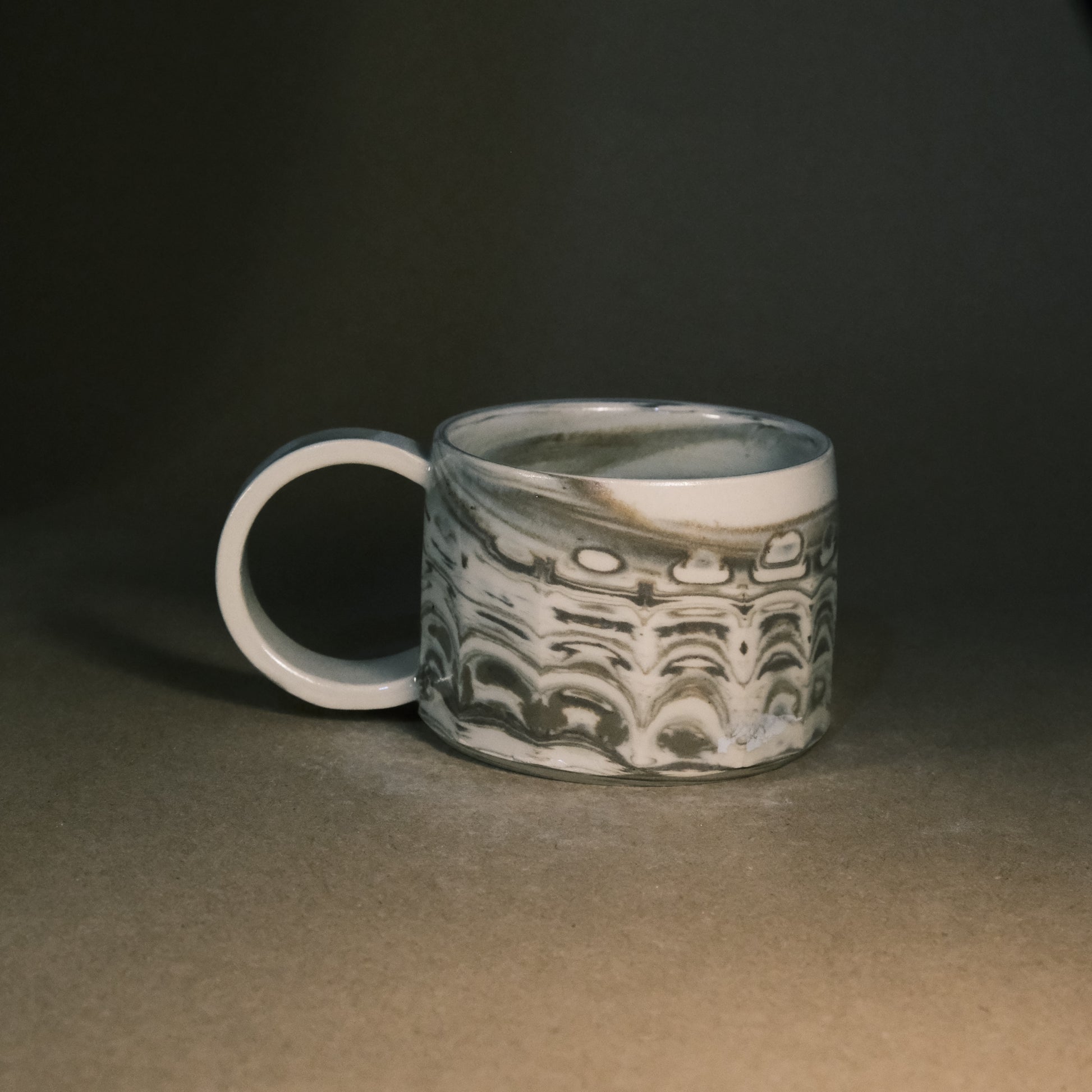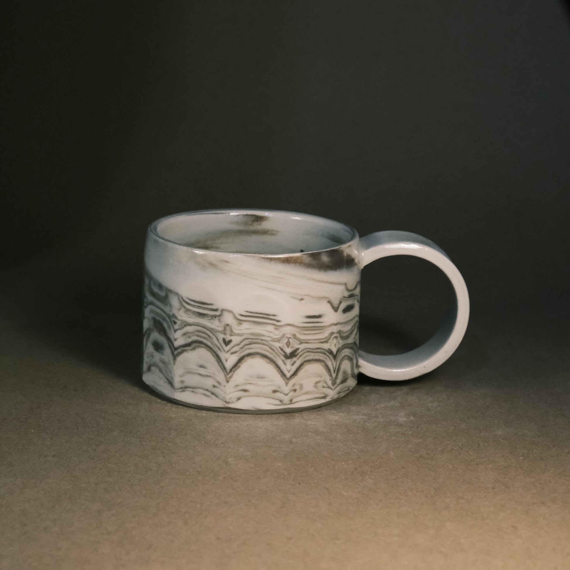 To create its dynamic surface, this stoneware cup is crafted by wedging two tones of brown clay with white stoneware. After throwing and trimming, I slice the surface with a peeler to create facets that reveal deeper, more complex layers of the marble pattern. This technique ensures every piece is a unique work of art before being high-fired to 1250°C in an electric kiln.