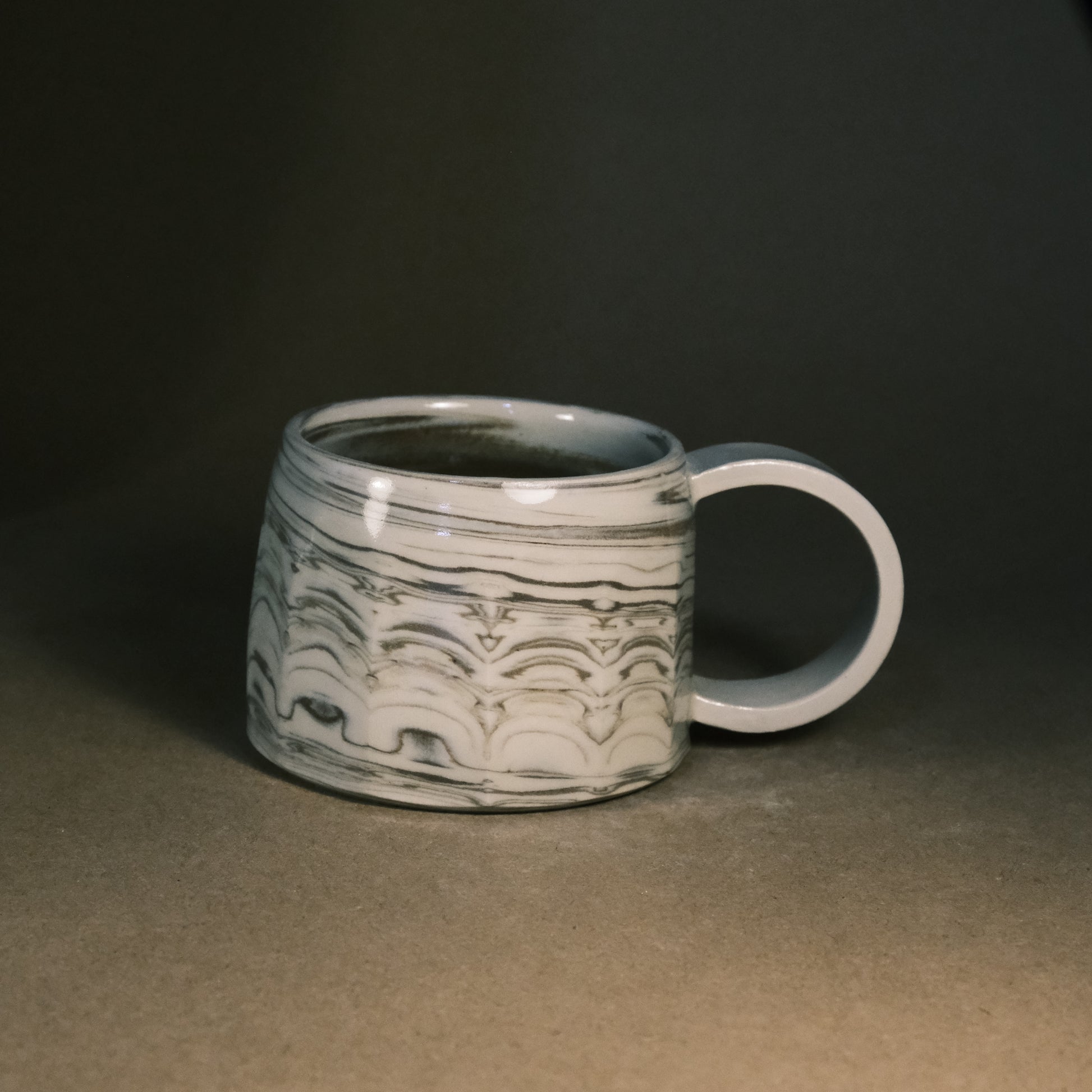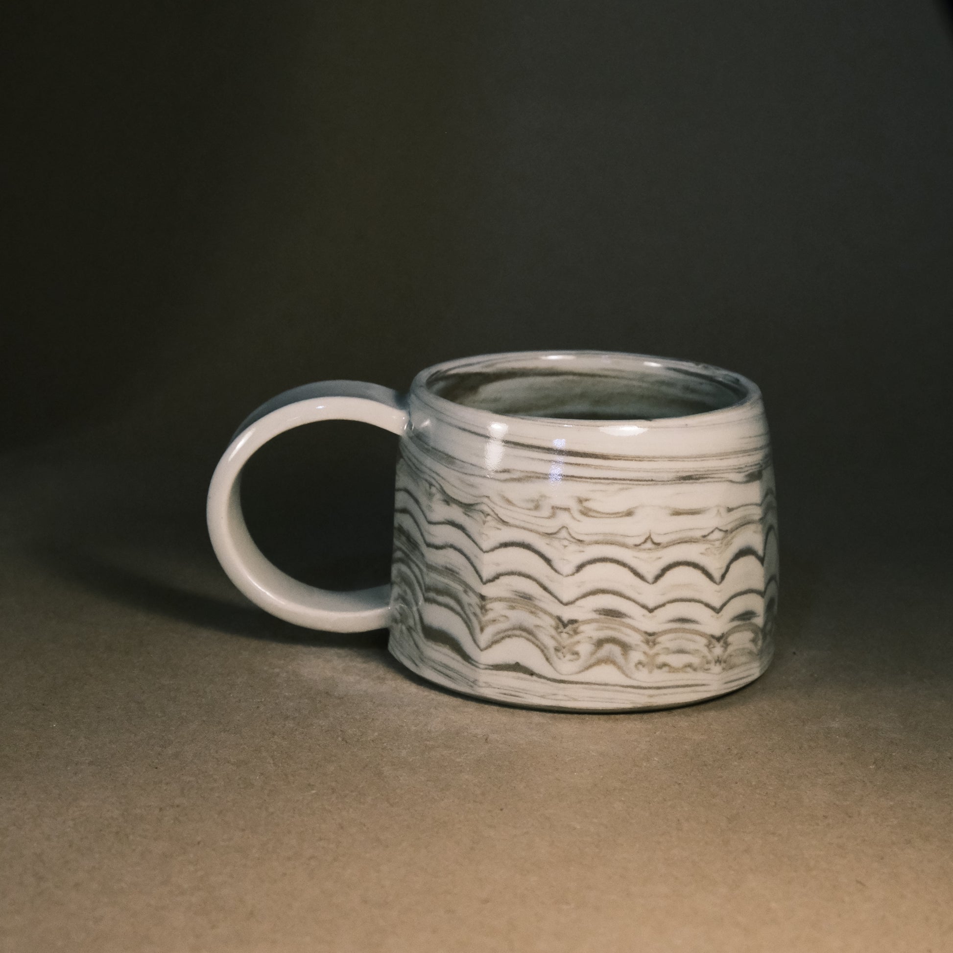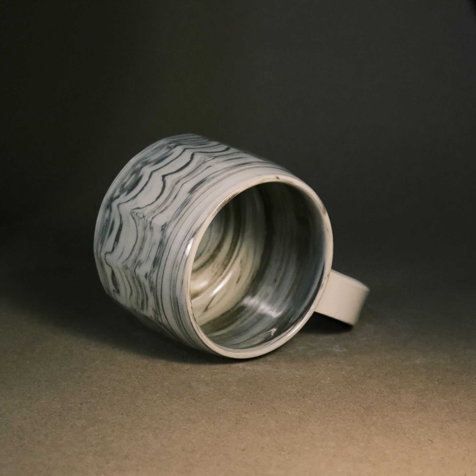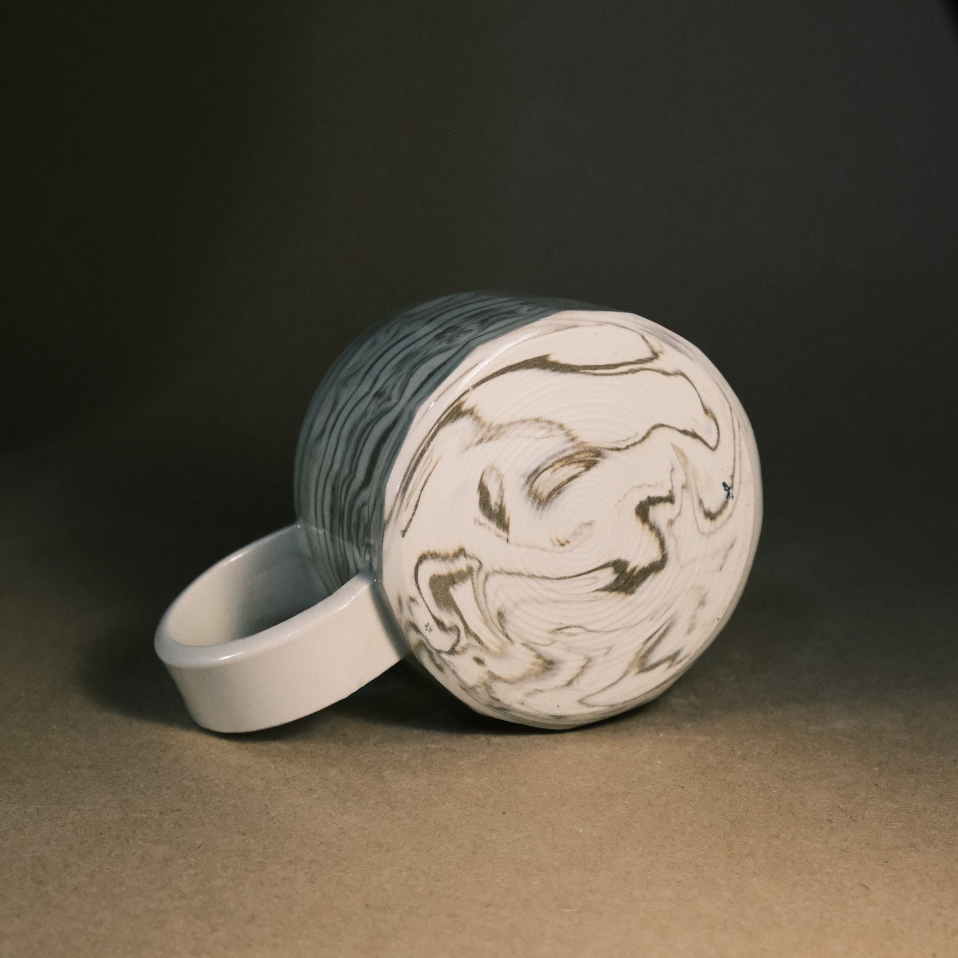 To create its dynamic surface, this stoneware cup is crafted by wedging two tones of brown clay with white stoneware. After throwing and trimming, I slice the surface with a peeler to create facets that reveal deeper, more complex layers of the marble pattern. This technique ensures every piece is a unique work of art before being high-fired to 1250°C in an electric kiln.
