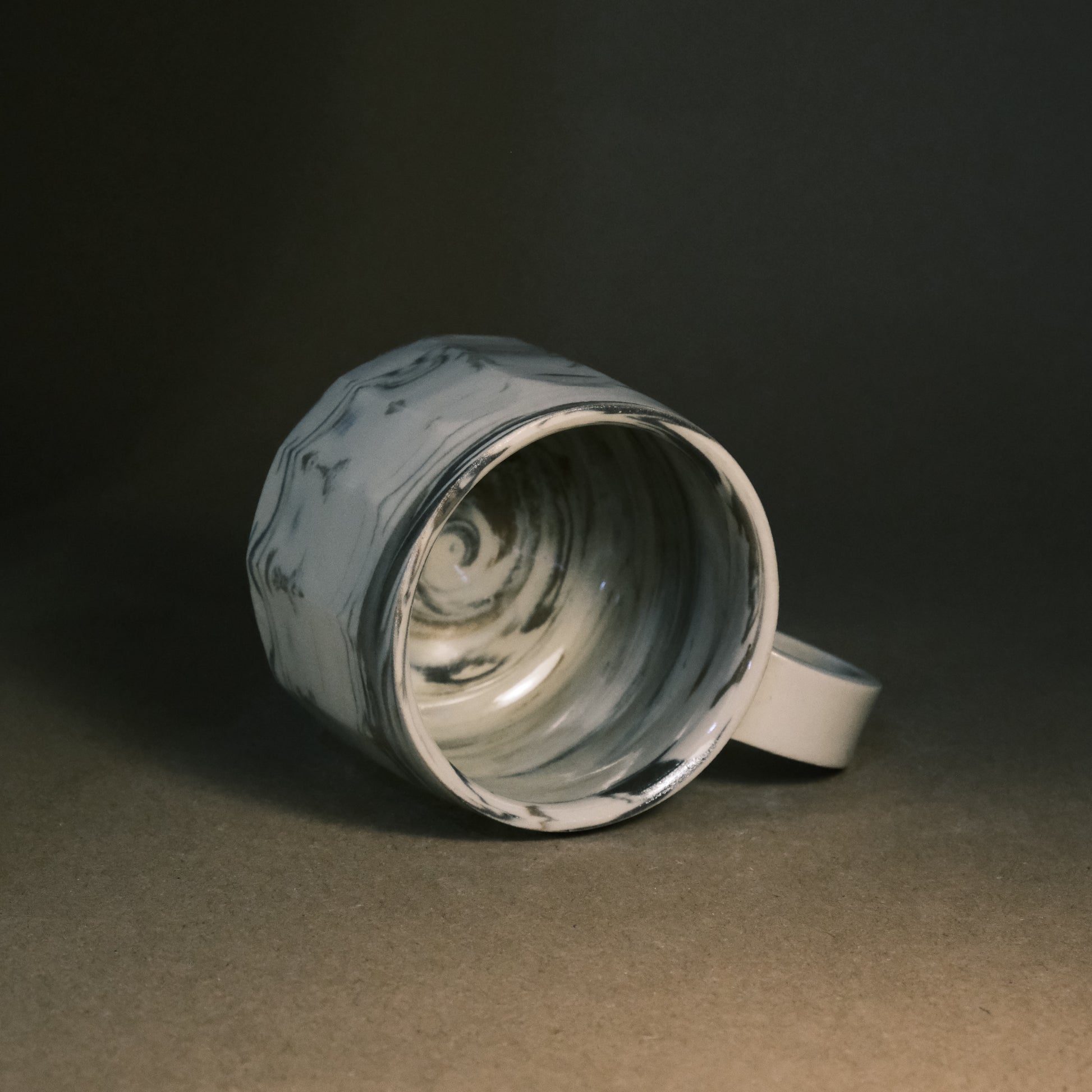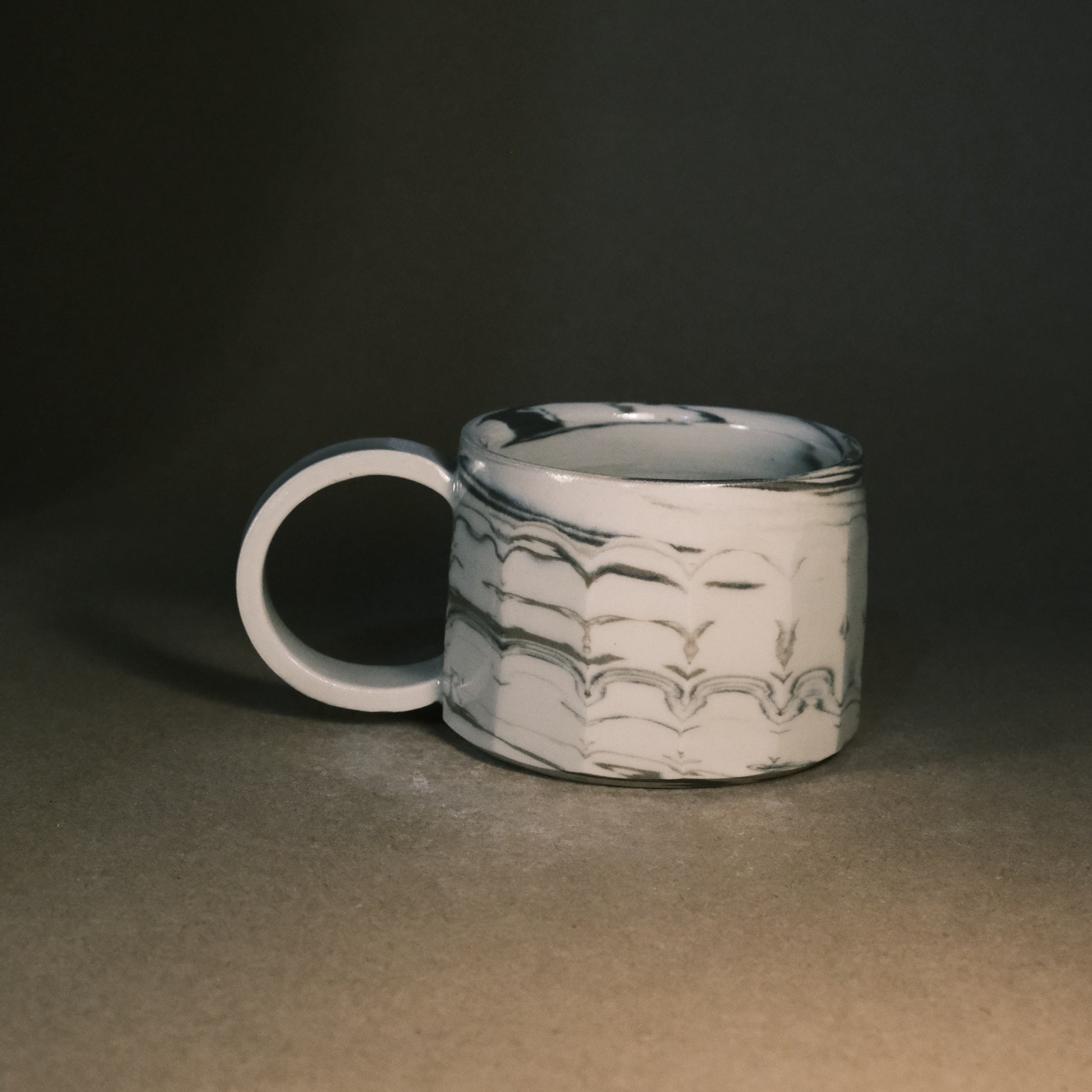 To create its dynamic surface, this stoneware cup is crafted by wedging two tones of brown clay with white stoneware. After throwing and trimming, I slice the surface with a peeler to create facets that reveal deeper, more complex layers of the marble pattern. This technique ensures every piece is a unique work of art before being high-fired to 1250°C in an electric kiln.