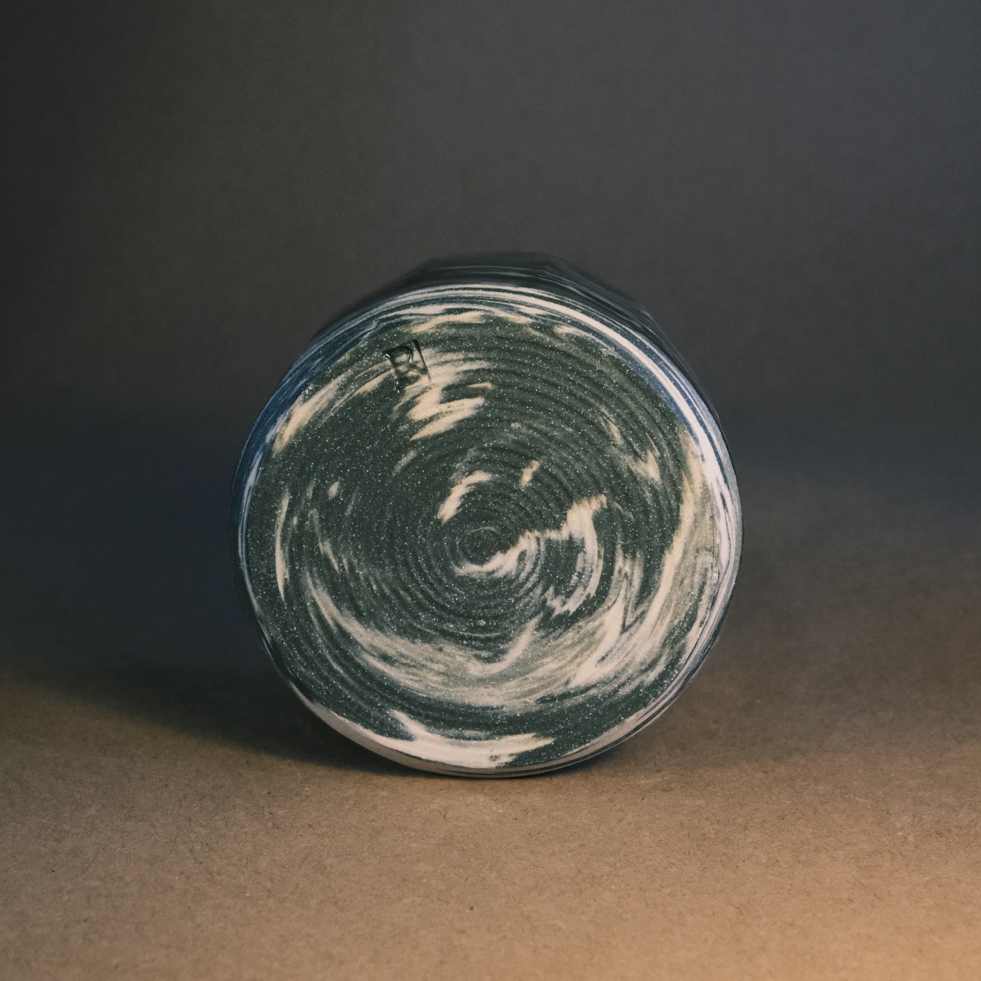 To create its dynamic surface, this stoneware cup is crafted by wedging two tones of matte green clay with white stoneware. After throwing and trimming, I slice the surface with a peeler to create facets that reveal deeper, more complex layers of the marble pattern. This technique ensures every piece is a unique work of art before being high-fired to 1250°C in an electric kiln.