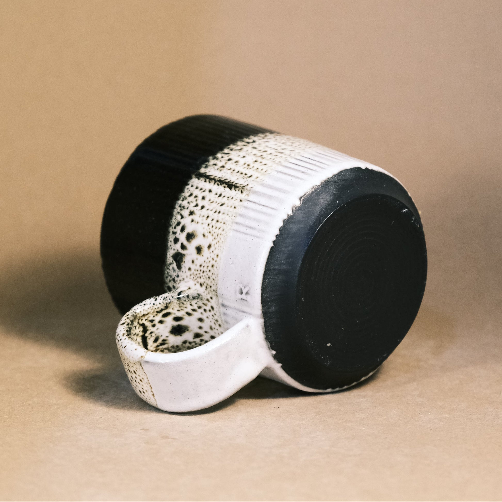 The interior is finished in a glossy black with a hint of brown. In contrast, the exterior showcases a leopard pattern on the midsection, formed by overlapping and dripping black and white glazes.