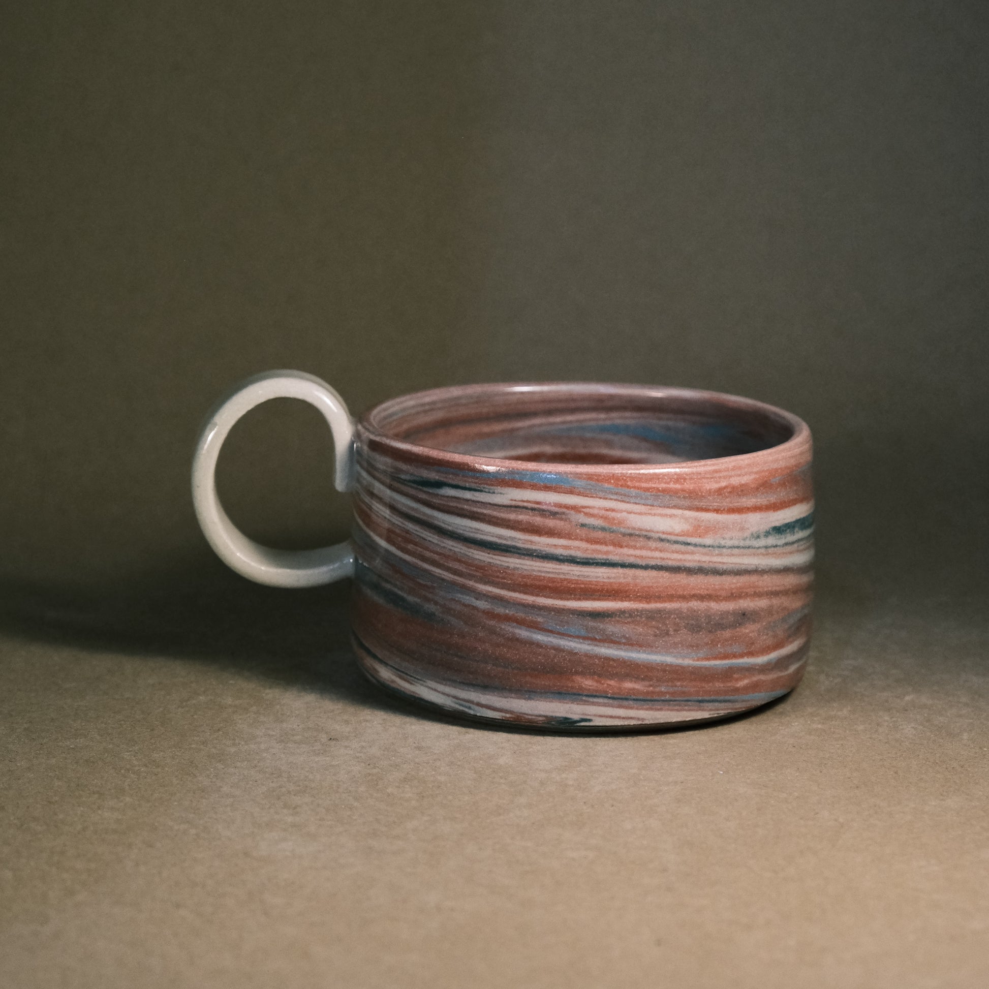 This stoneware mugs is high-fired to 1250°C in an electric kiln. To achieve its unique marble effect, stained clay is wedged together by hand before each piece is individually thrown and turned on the wheel. The pattern on every mug is unique, determined by the specific wedging process and the ratio of coloured clays used.