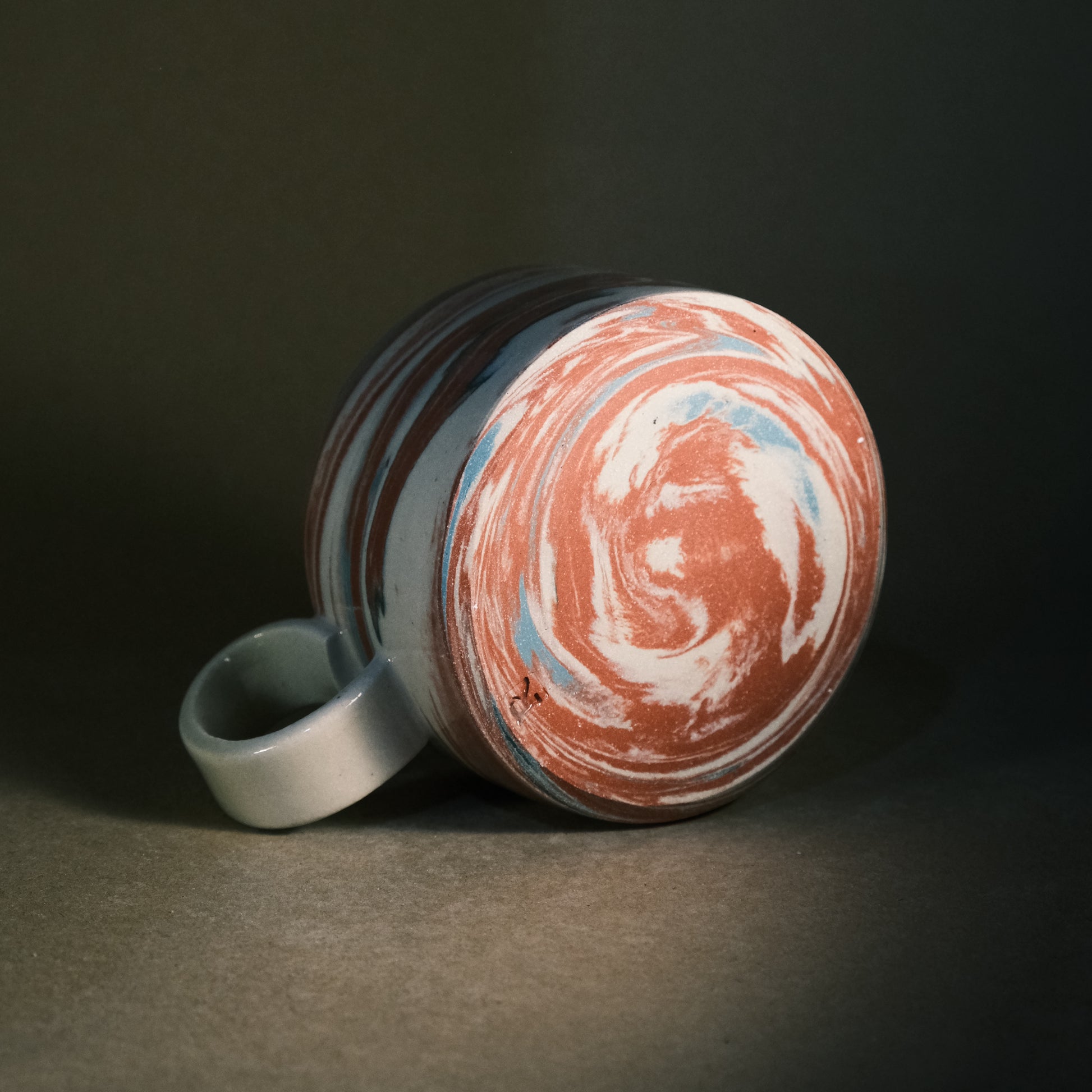 This stoneware mugs is high-fired to 1250°C in an electric kiln. To achieve its unique marble effect, stained clay is wedged together by hand before each piece is individually thrown and turned on the wheel. The pattern on every mug is unique, determined by the specific wedging process and the ratio of coloured clays used.