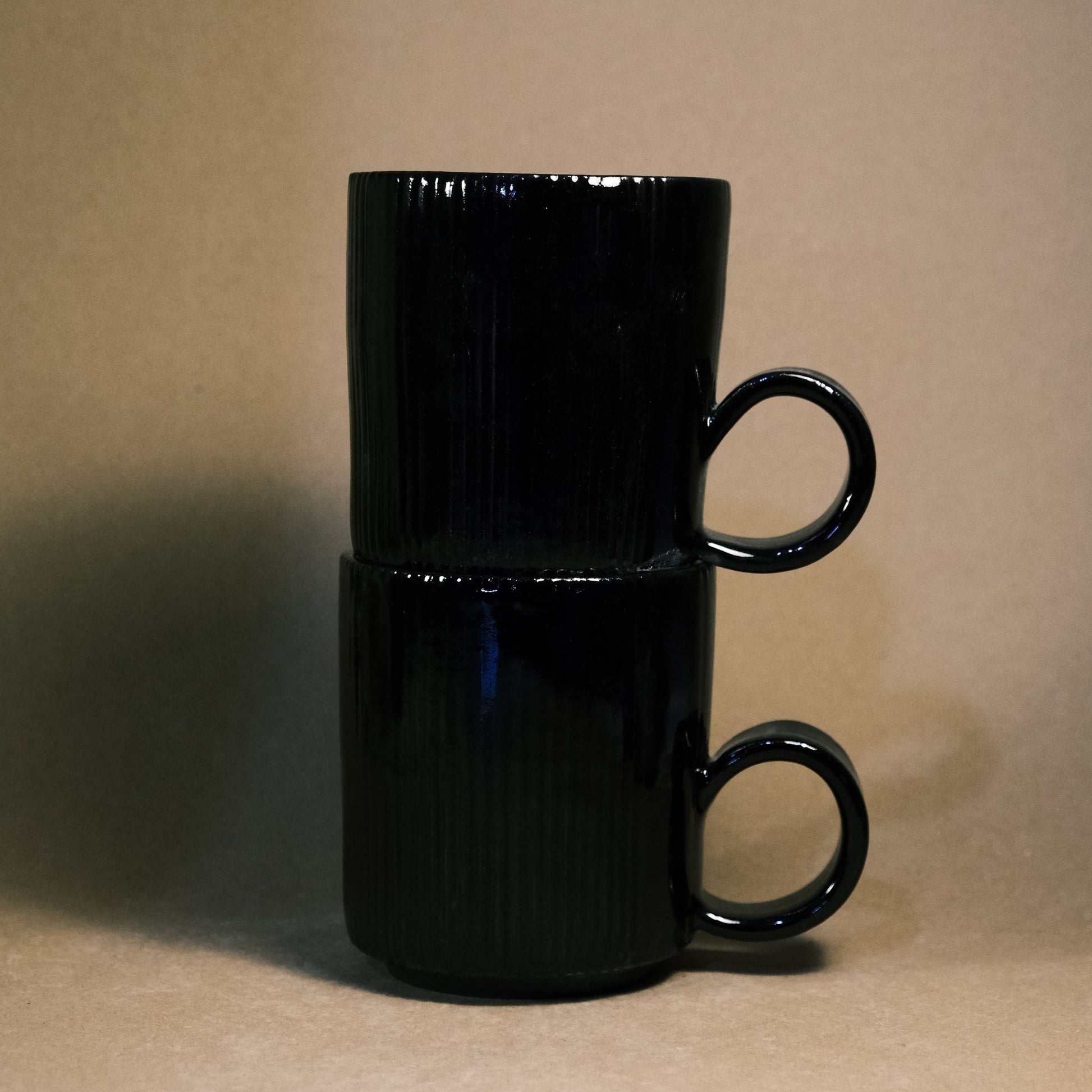 These black stoneware mugs are individually thrown and turned on the wheel, then high-fired to 1220°C in an electric kiln.